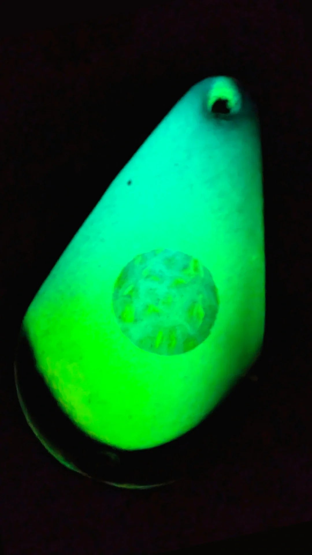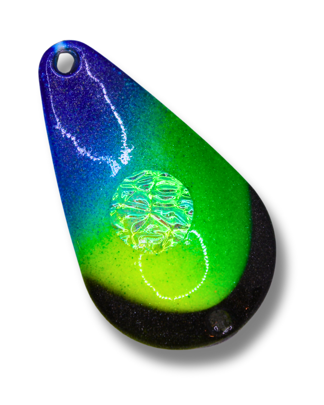 This ultra glow casting spoon features a multi-species pattern that is built for the river, lake, shore, or pier. Featuring our new glow product, holographic vinyl and UV florescent colours.
